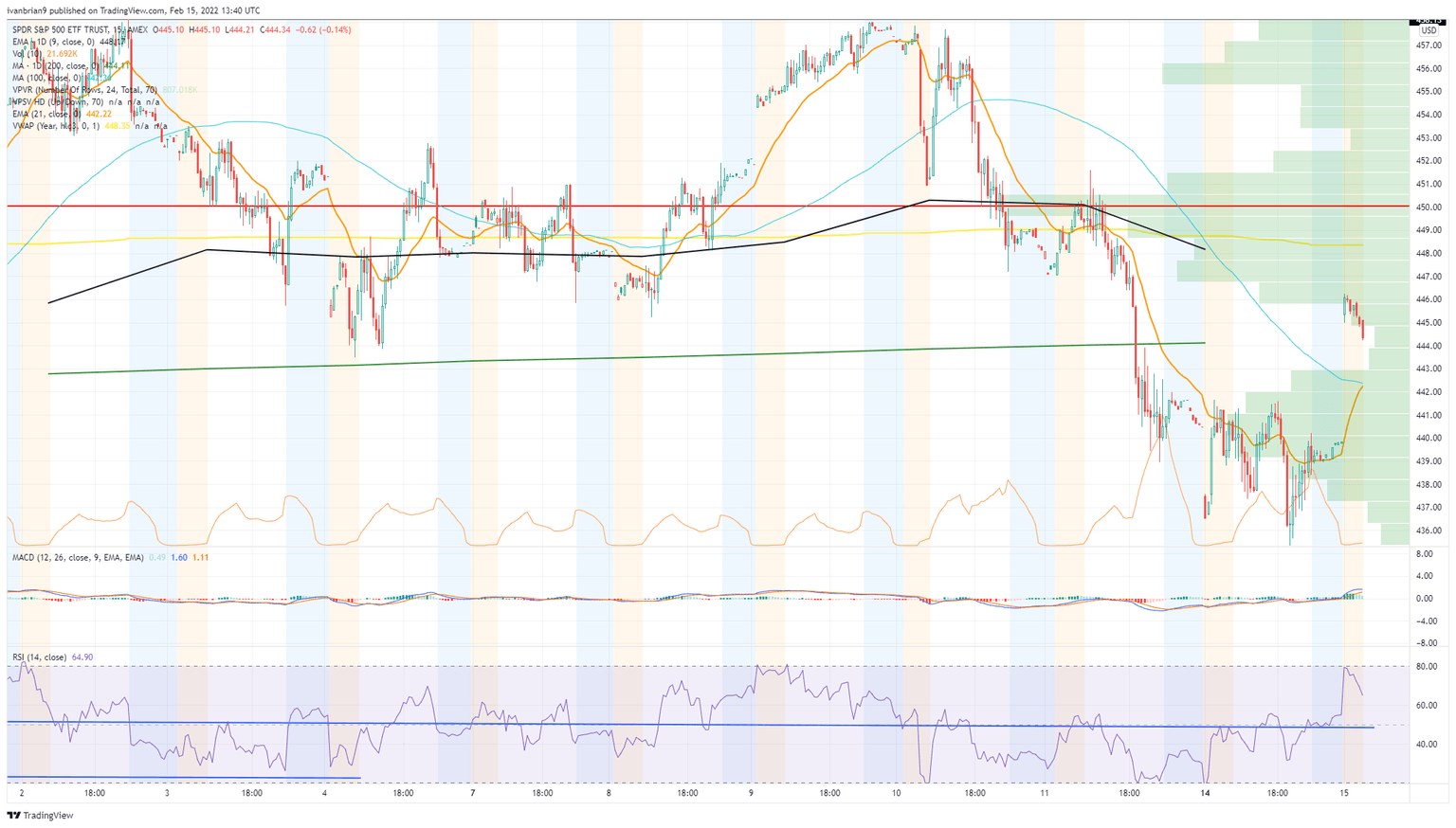 The 15-minute chart gives us some more short-term swing trading info. Volume is high around $450 for February. It has basically been the equilibrium point for February. We gapped quickly from $450 to $440 and printed a lot of volume there. So there is a volume gap between that this geopolitical calming can take advantage of. We remain in the chop zone, $428 and $458 are the pivots.