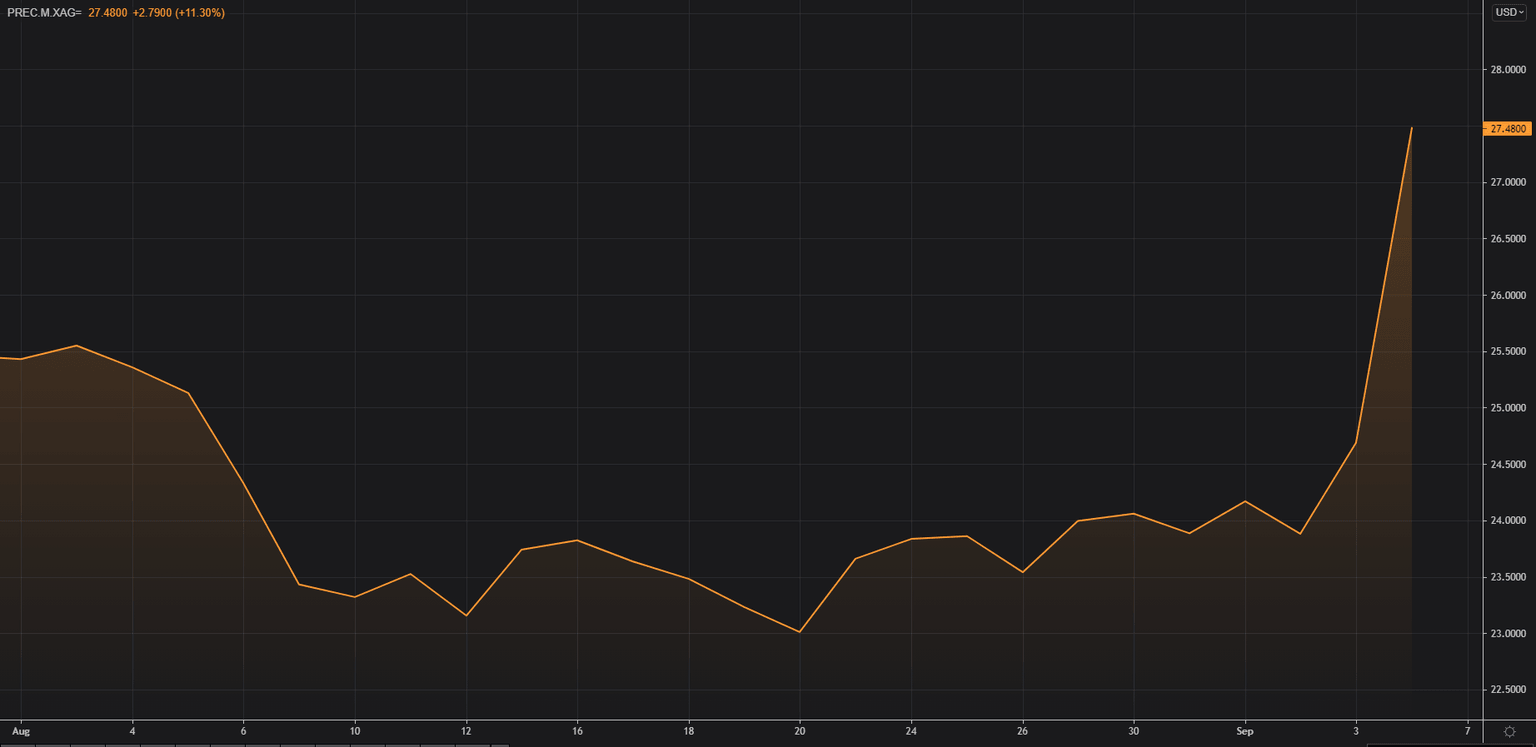 Spot silver prices (XAG/USD) shot higher during the American trading hours on Monday and rose more than 10% in a matter of minutes. As of writing, the XAG/USD pair was trading at its highest level since June 15 at $27.48, up 11.3% on a daily basis.
