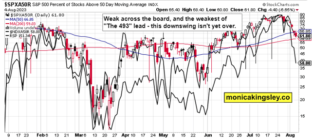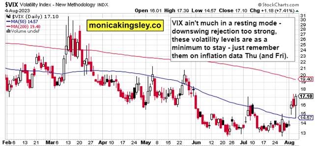 S&P 500 couldn‘t keep the fine rebound as all eyes were on „good that the job market is still OK, but maybe the Fed would stop hiking now“ interpretation of weaker than expected non-farm payrolls. Bonds certainly played ball, but it was more than the dollar that pulled stocks down – all sectors declined from whichever high they had reached intraday, in spite of yields not moving adversely. I read that 2-hours lasting disapprearance of bid as a clear warning sign that the bears have the short-term upper hand now – even if stocks attempt to retrace the downside again, the upcoming (Thursday and Friday) inflation data would show that disinflation is over (3.3 or even 3.4% headline – as inflation month on month starts adding up again through the autumn at least).