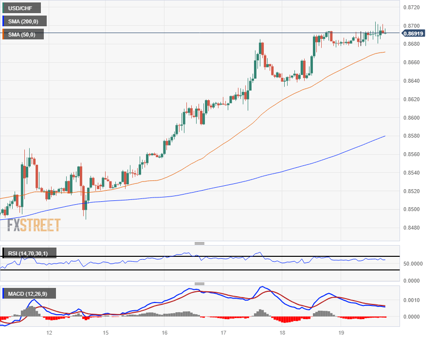 The US Dollar is up around 1.85% against the Swiss Franc this week, climbing from Monday’s early bids near 0.8525, tapping the 0.8700 handle on Friday heading into the week’s closing bell.