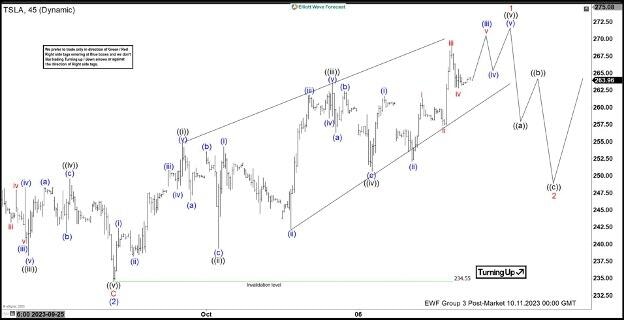 Short Term Elliott Wave in Tesla (TSLA) shows that the rally from 8.18.2023 low is in progress as a 5 waves impulse. Up from 8.18.2023 low, wave (1) ended at 278.99 and dips in wave (2) ended at 234.58. The stock has turned higher in wave (3). Up from wave (2), wave ((i)) ended at 254.77 and pullback in wave ((ii)) ended at 239.35. The stock resumed higher in wave ((iii)) towards 263.6 and dips in wave ((iv)) ended at 250.65.
