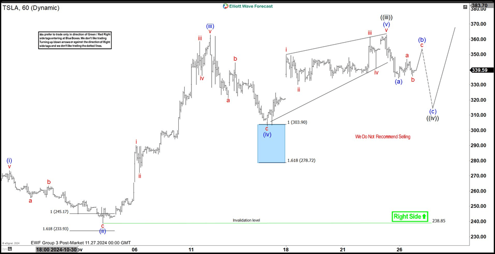 Short Term Elliott Wave View in Tesla (TSLA) suggests the rally from 8.5.2024 low is in progress as a 5 waves impulse. Up from 8.5.2024 low, wave ((i)) ended at 264.86 and pullback in wave ((ii)) ended at 212.11. Stock then rallied in wave ((iii)) with subdivision as another impulse in lesser degree. Up from wave ((ii)), wave (i) ended at 273.54 and pullback in wave (ii) ended at 238.88. Stock then rallied higher again in wave (iii) towards 362.80 and pullback in wave (iv) ended at 302.7