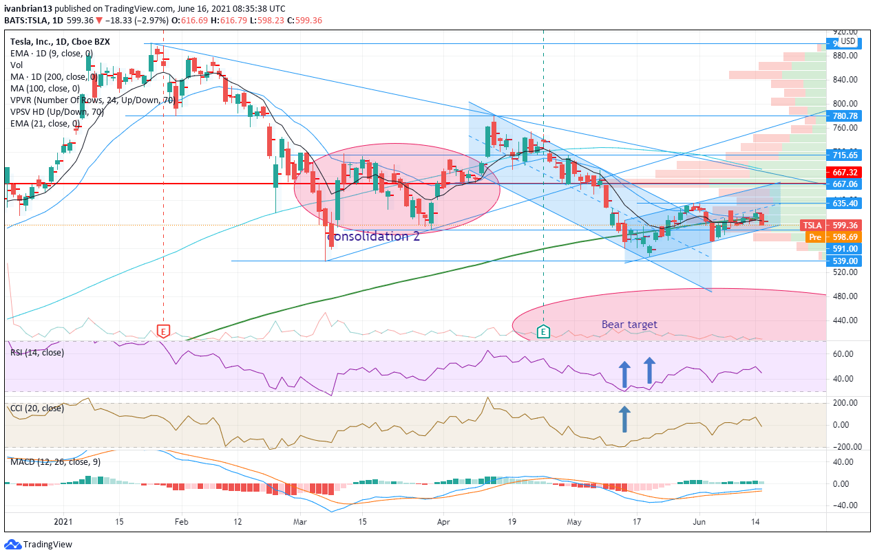 $539 remains a key support level as volume drops off alarmingly below this level, meaning any break will most likely accelerate toward the identified bear target. $635 remains key to the upside for trend continuation. Tesla stock is still holding a bullish trend as identified by the trend channel and breaking $635 will lead to a test of $667. This $667 resistance is also the point of control since 2021. The point of control is the equilibrium price, the highest volume of buying and selling equilibrium.