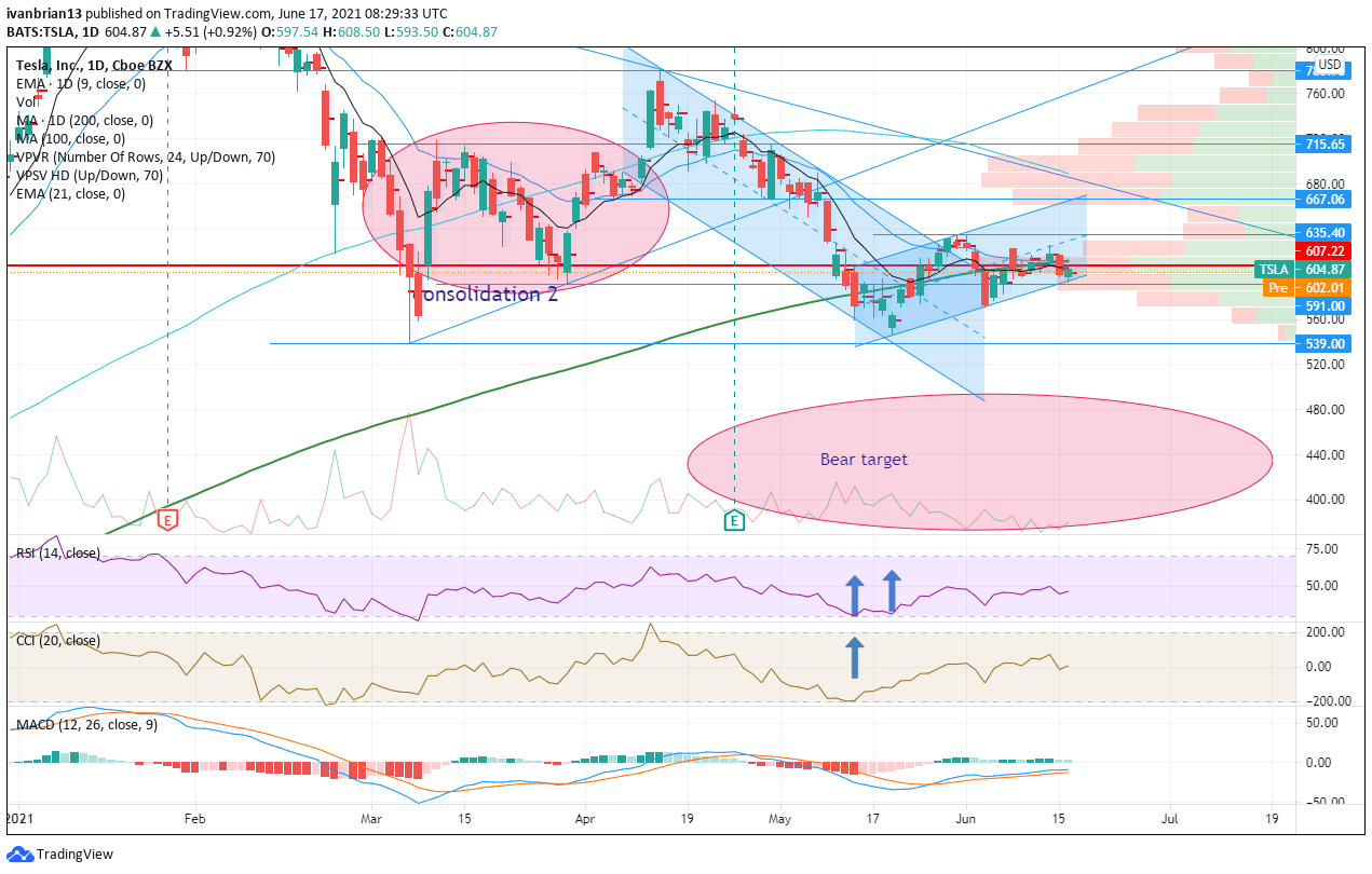 Update June 17: After overcoming the surprisingly hawkish Fed decision, Tesla Inc (NASDAQ: TSLA) has been extending its gains on Thursday, this time rising along with broader stock markets. Shares of Elon Musk's electric vehicle maker are buoyed by the recent presentation of a new model and by growing investment in the sector. Maintaining a safe distance from the round $600 level opens the door to $635, as explained in-depth below.