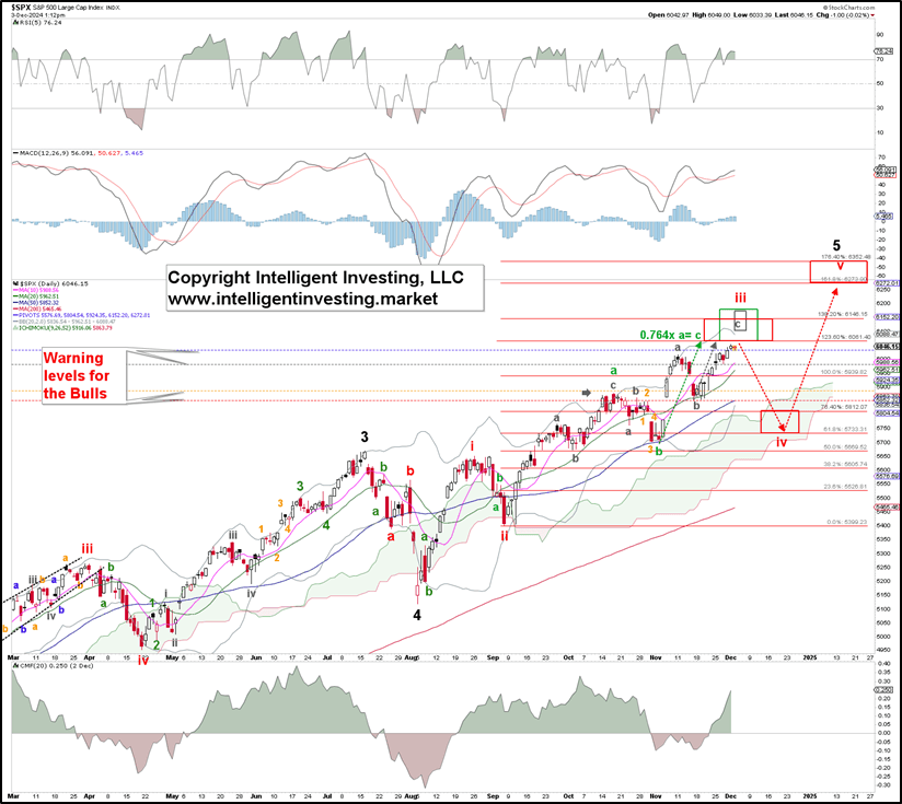 We can raise our warning levels from our last update: if the index can stay at least above SPX5984, and especially the November 21 low at SPX5887, we must allow it to ideally target SPX6060, possibly as high as SPX6175 before the next correction of around 5-7% can start.