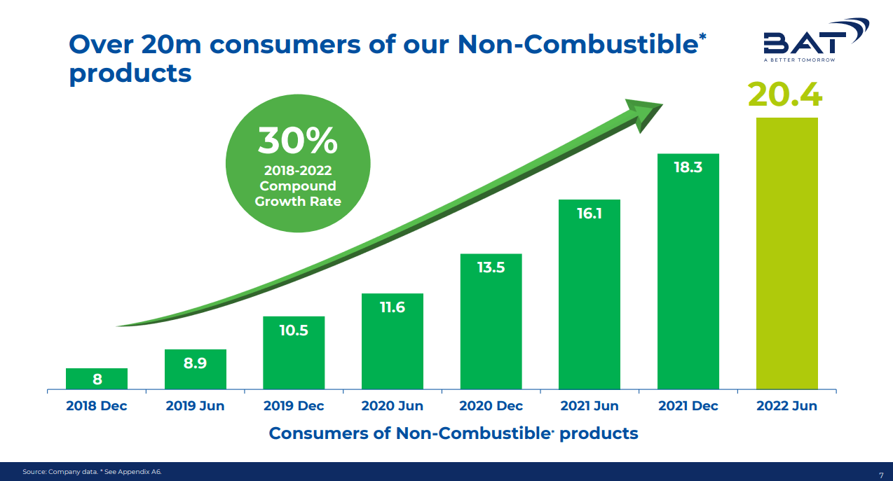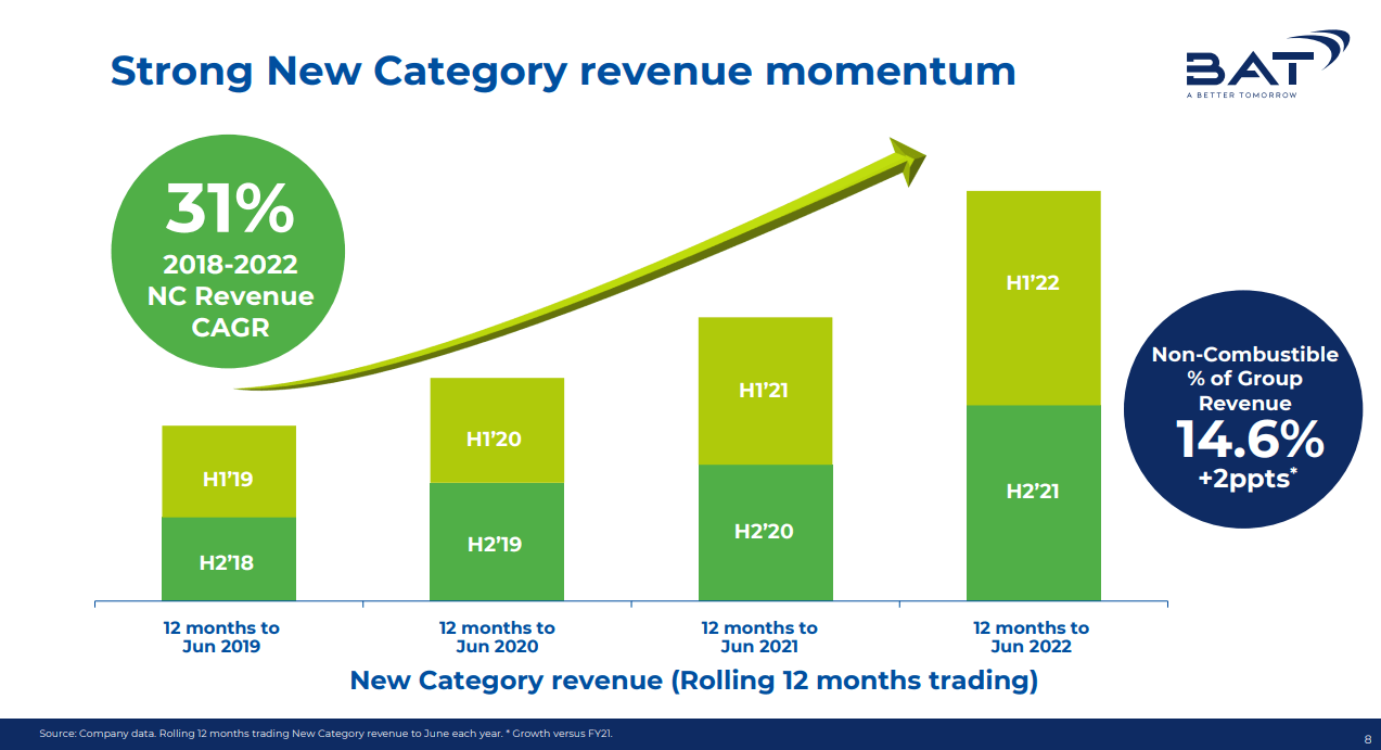 British American Tobacco (BTI) currently offers an attractive yield of 7.5%. BTI holds over $5 billion in cash on its balance sheet. The recent sell-off in the stock market has not been felt here with BTI actually up 5% so far year to date. BTI has expanded its revenue stream into the growing e-cigarette business and expects this growth to continue. As we can see from the company slides below, non-combustible now accounts for nearly 15% of total revenues. This sector is growing sharply, reducing BTI's dependence on cigarettes.