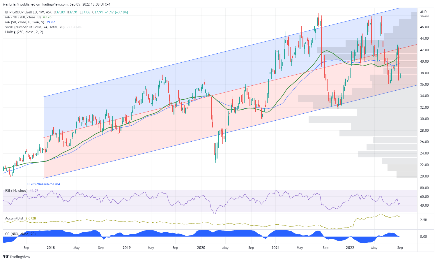Technically, we can see BHP has already priced in a global slowdown and has retraced much of its recent gains. The pandemic low is $22, and it is unlikely we will test that price given the current macro environment. Inflation is typically supportive of rising commodity prices. There is the possibility of some headwinds ahead as the bear market in equities continues and China deals with its likely property sector slowdown. This could present an interesting pullback for BHP in my view. It is an attractive long-term proposition to combat inflation and potential rising commodity prices.