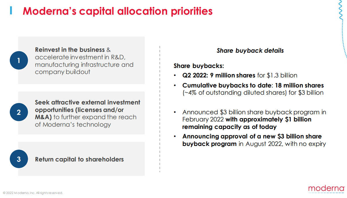 Recent trends in various countries approving the Omicron vaccine attest to further demand. Moderna in short is a play on its strong cash position. It recently completed a massive buyback program and has the capital to do more by returning capital to shareholders via dividend. The company has already announced a new buyback program of $3 billion.