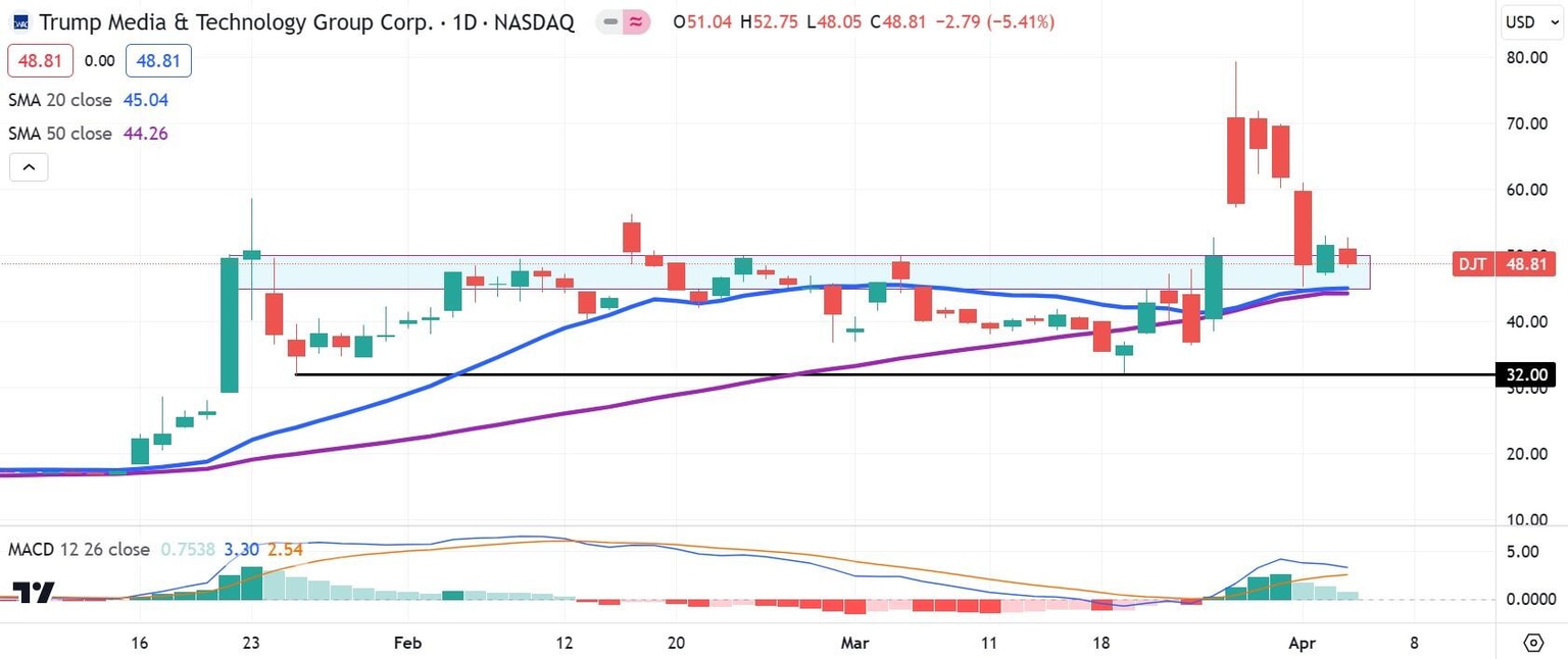 - The $45 to $50 window is acting as a new support region for DJT.