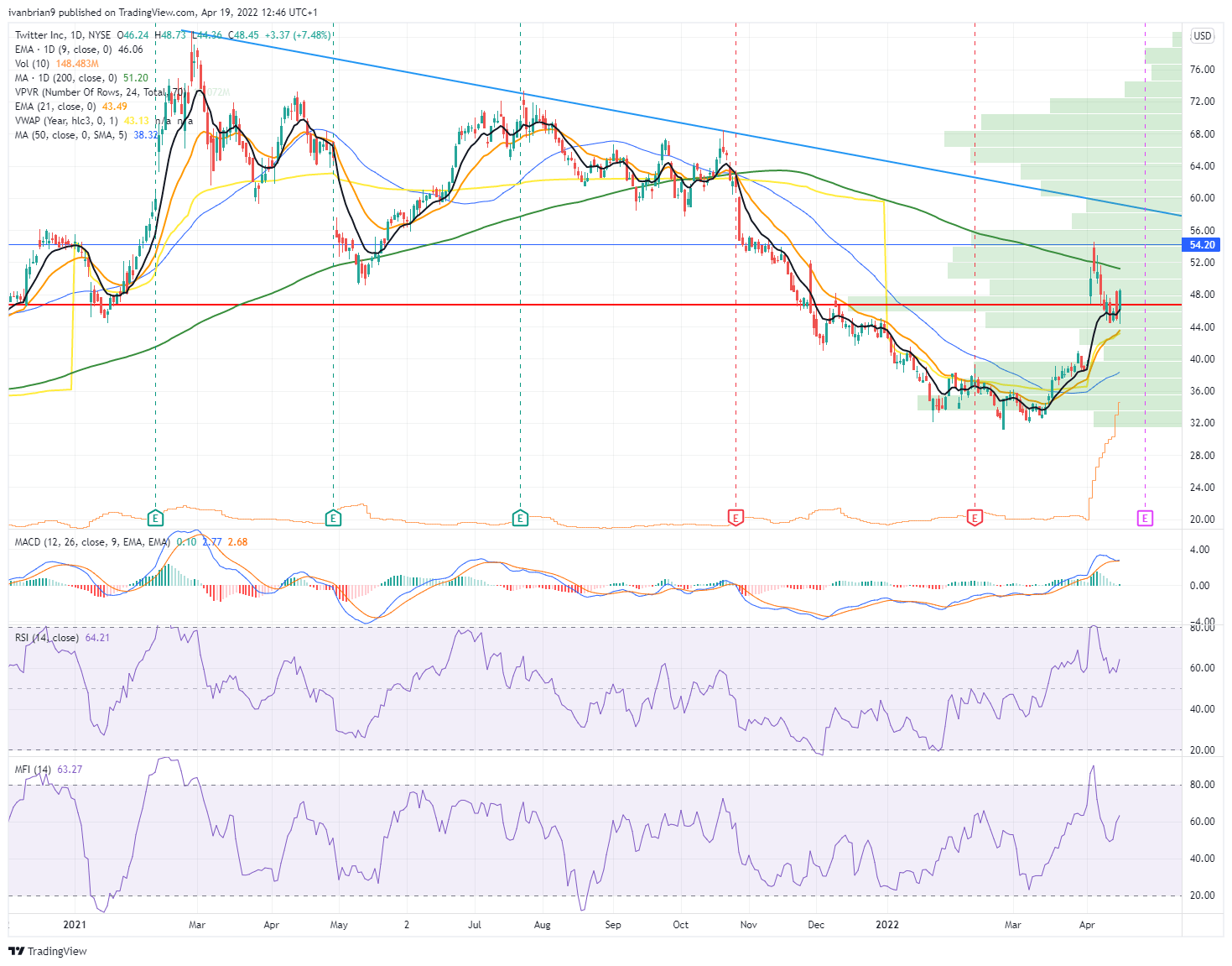 Twitter (TWTR) stock rallied sharply on Monday as speculation intensified over potential bidders for the company. Latest reports show the company appears to definitely be in play with multiple suitors lined up to challenge Musk's bid. If you have been living under a rock, Elon Musk unveiled a 9.2% stake in Twitter only a couple of weeks ago. The Twitter board offered Musk a seat, which he rejected. This was likely an attempt at a "keep your enemy closer" strategy as board members cannot launch a takeover bid for the company. The rejection put Twitter in play, and subsequently Elon Musk offered to buy the remainder of TWTR stock for $54.20 in cash. He stated it was his final offer.