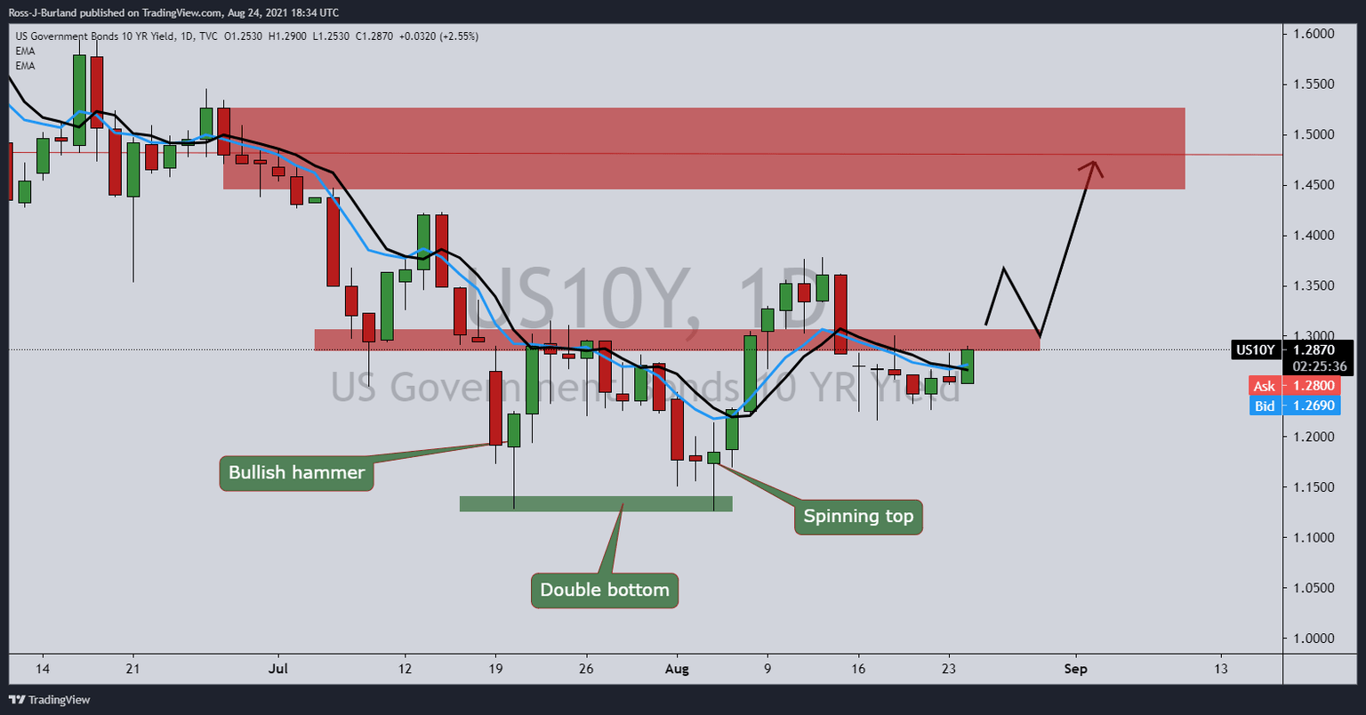 We have a bullish hammer printed on July 20, followed by a double bottom on Aug 4, although this was followed by a failure of a restest of old resistance structure near 1.2950/1.3030:
