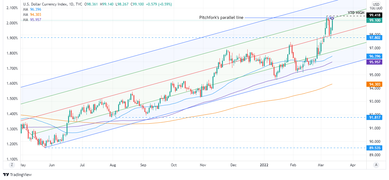 - US Dollar Index (DXY) Technical Outlook: Upward biased, though testing Pitchfork’s parallel line just above the 99.00 mark.