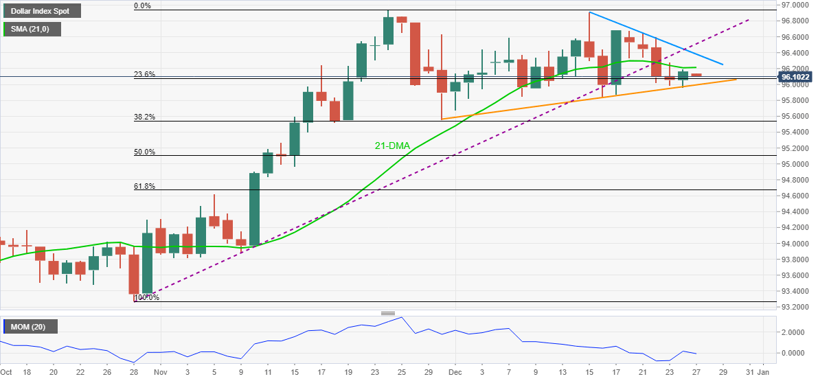 The greenback gauge bounced off a one-week low the previous day while taking a U-turn from an upward sloping support line from November 30. However, the rebound couldn’t cross the immediate upside hurdle, namely the 21-DMA, which in turn joins the downbeat Momentum line to keep bears hopeful.