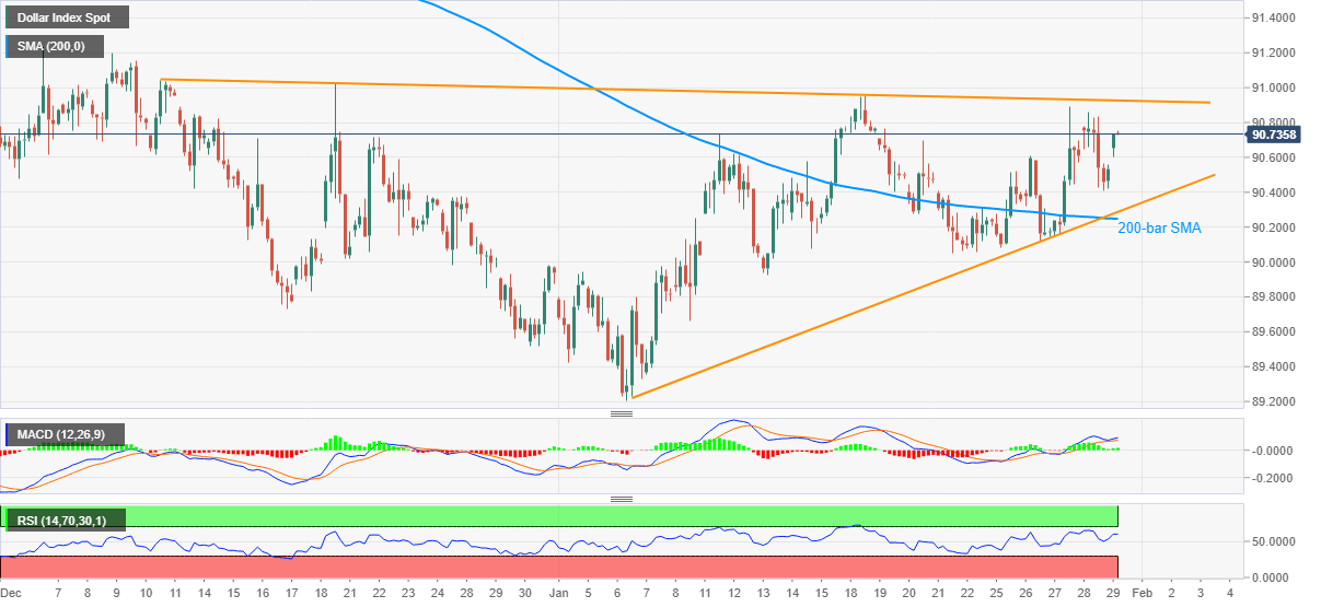Alternatively, an ascending trend line from January 06, currently around 90.28, joins a 200-bar SMA level of 90.24 to challenge the bears.