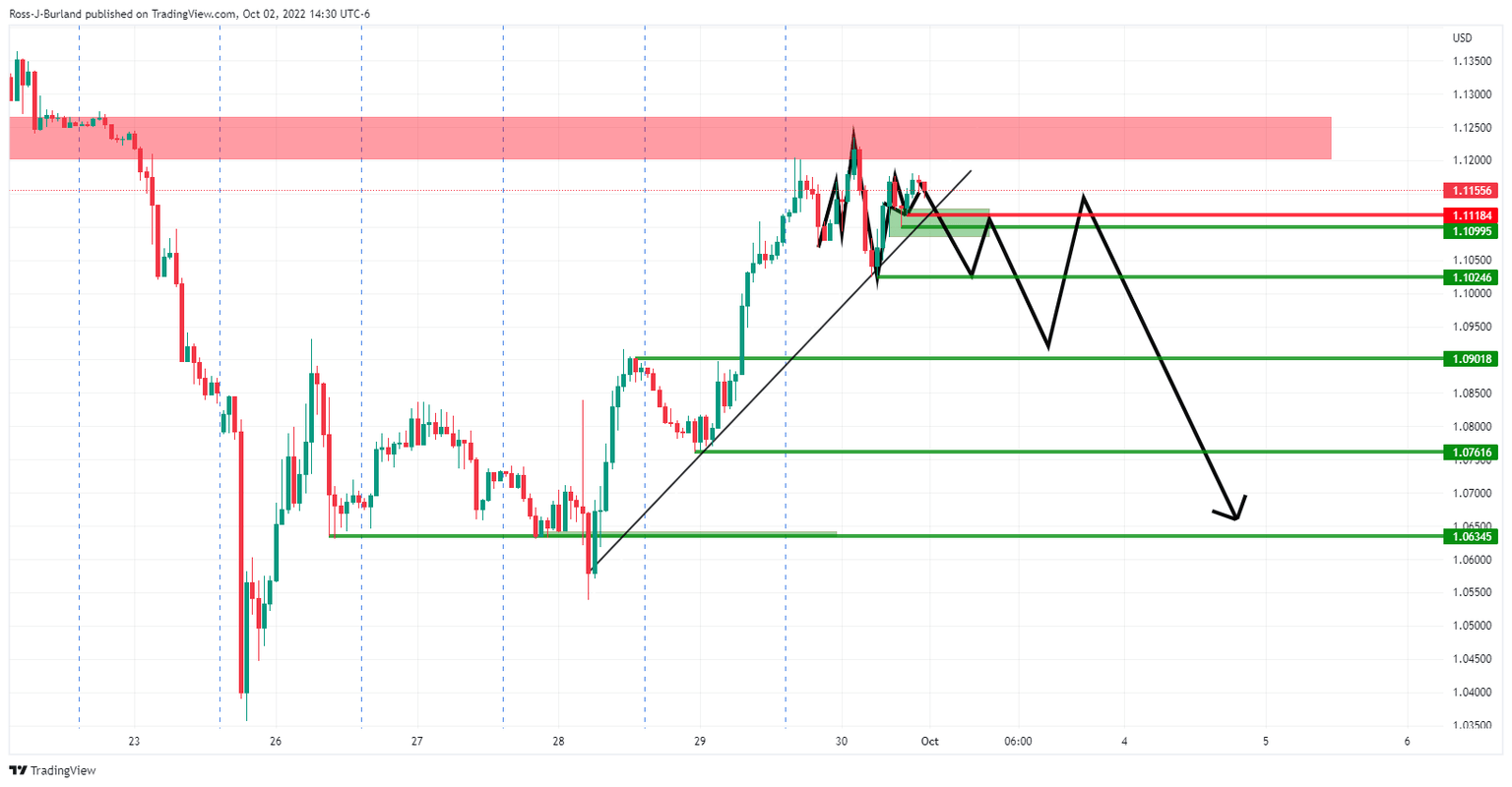 The harmonic pattern played out with the bears moving in at a key resistance structure to push the price all the way into the neckline of the formation in a significant retracement towards the 78.6% Fibonacci level. For the open, bulls will be in anticipation of a move towards the prior resistance near 112.70. This puts the focus on the downside for corresponding pairs such a cable: