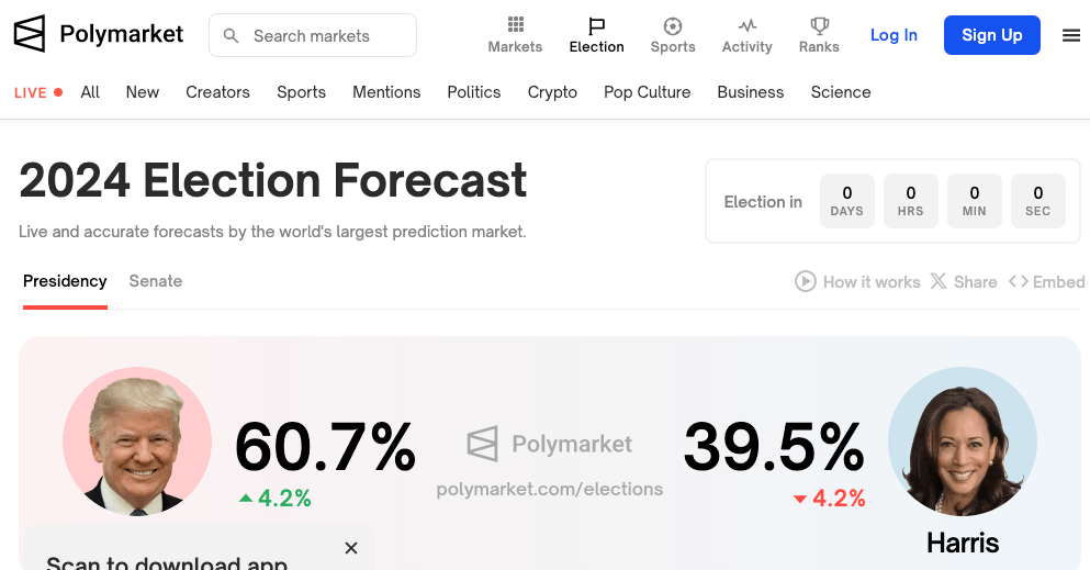 As the time approaches, election polls increasingly show Donald Trump has an advantage over his rival. Kalshi shows an overwhelming 57% to 43% Trump's advantage over Harris, while Polymarket puts the figures at 60.7% and 39.5%, respectively.