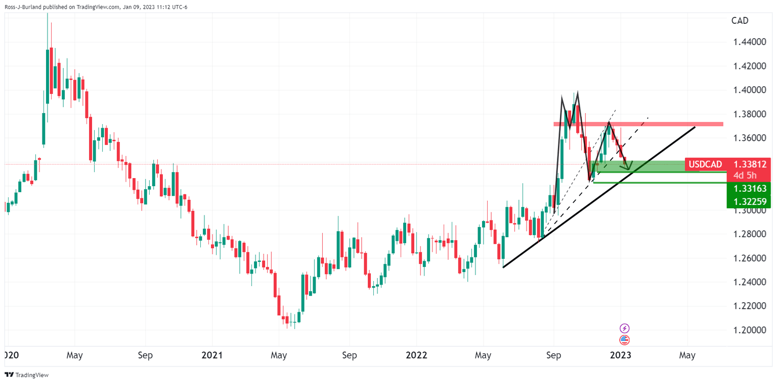 USD/CAD has been pressured to a key area on the charts as the price of oil rallies while risky currencies benefited from China reopening borders. At the time of writing, USD/CAD is trading at 1.3370 and is down over 0.5% as we head towards the close of the first day of the week.
