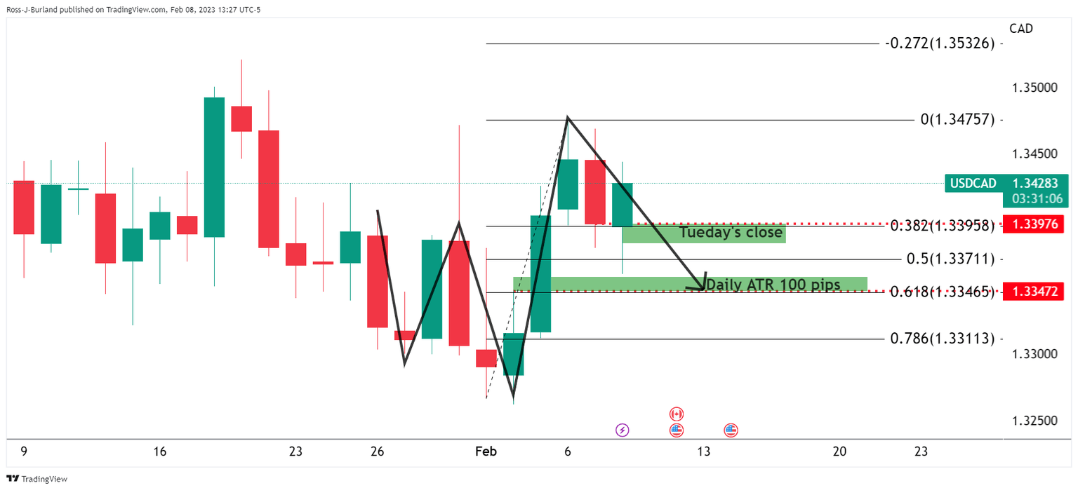 At the time of writing, USD/CAD is trading towards the highs of the day but the bears are present, chipping away as a key support structure of the consolidation of the day's highs. USD/CAD has travelled between a low of 1.3359 and 1.3444 so far and has been forced higher on a dovish sentiment at the Bank of Canada that has hiked its key interest rate to 4.5% in January, the highest level in 15 years.