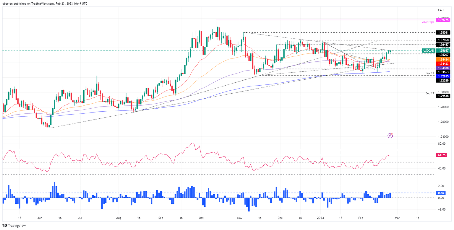 USD/CAD climbs toward 1.3560s and tests a major resistance trendline, post-US economic data