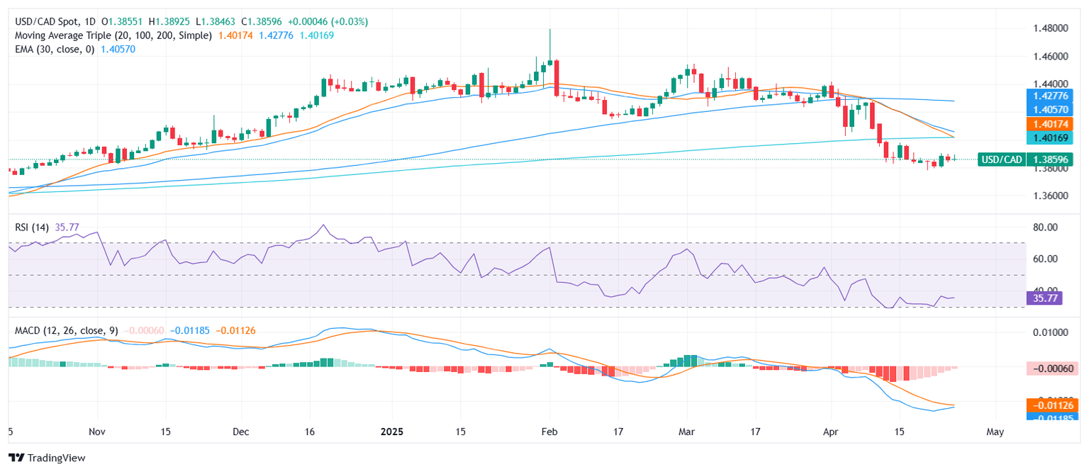 USD/CAD is flashing an overall bearish signal, trading flat near 1.3900 and consolidating within the intraday range of 1.3846 to 1.3893. The Relative Strength Index (RSI) sits neutrally at 36, while the Moving Average Convergence Divergence (MACD) shows a sell signal, hinting at downward pressure.