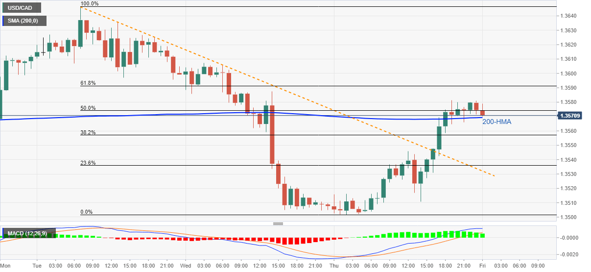 USD/CAD eases to 1.3575 during Friday’s Asian session. Even so, the pair seesaws around 50% Fibonacci retracement of July14-16 fall while also saying beyond 200-HMA. Also confirming the bullish bias is the MACD histogram and the quote’s sustained trading beyond a descending trend line from Tuesday.