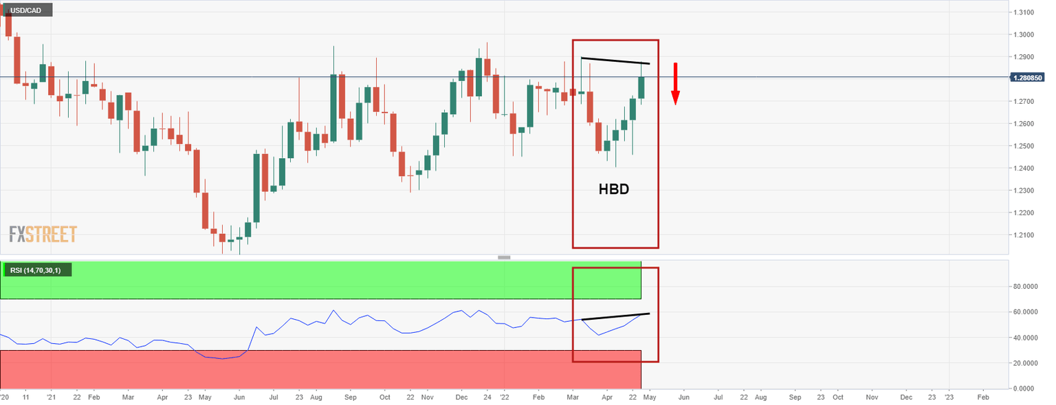 As per the prior analysis, USD/CAD Price Analysis: The end of the rally is nigh according to market structure, despite a surge higher in the greenback to 20-year highs, the bears are growling back and a bearish outlook persists for the pair as follows: