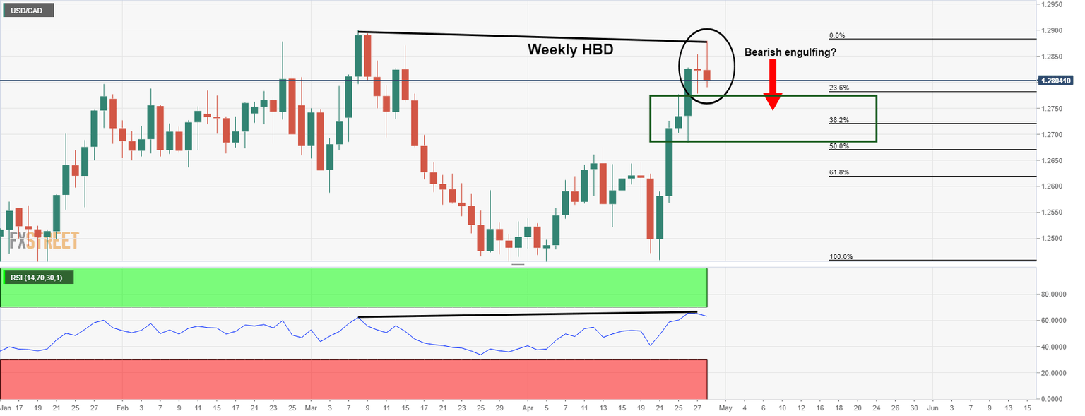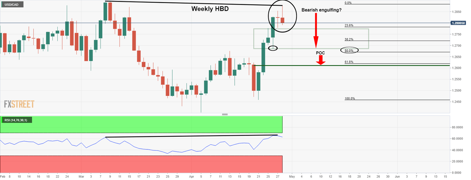 The current price action is leaving the prospects of a bearish engulfing daily close following the prior day's doji. This is regarded as bearish and a prelude for the next days. There are expectations of a correction to test the 1.2770s, and then potentially as deep as a 38.2% Fibonacci retracement below 1.2750.