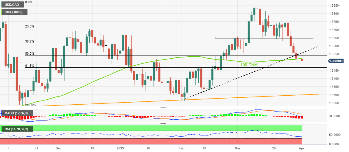 Meanwhile, the 100-DMA and the previous support line restrict short-term USD/CAD rebound near 1.3525 and 1.3565 in that order.