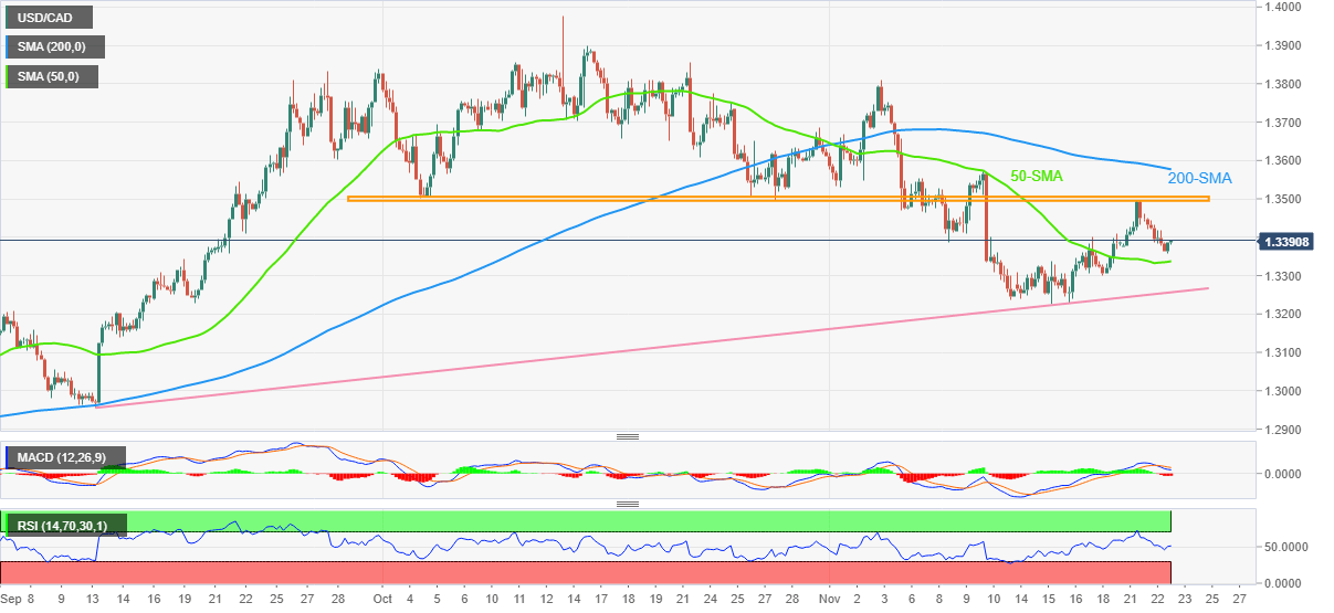 However, the quote’s sustained trading beyond the 50-SMA and an upward-sloping support line from September 13, respectively near 1.3340 and 1.3255, seem to keep the USD/CAD buyers hopeful.