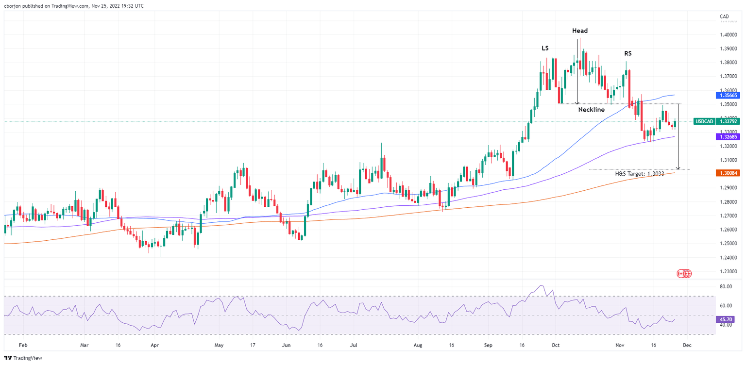 Delving into the USD/CAD daily chart, the major erased Thursday’s losses, though it faltered to crack the 1.3400 figure after reaching a daily high of 1.3398. Although the US Dollar is buoyant, traders should know that the head-and-shoulders chart pattern is still in play. However, the USD/CAD needs to tumble below 1.3300 and the 100-day Exponential Moving Average (EMA) at 1.3268 to exacerbate a fall toward the head-and-shoulders chart pattern. Otherwise, the USD/CAD might jump above the 1.3500 neckline and invalidate the pattern.