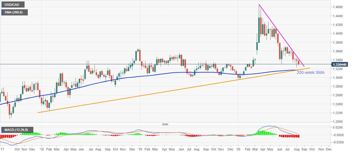 USD/CAD recedes to 1.3300, following its drop to 1.3293, during the early Wednesday morning in Asia. The loonie pair drops for the fifth consecutive week amid bearish MACD. The same suggests further downside momentum towards a confluence of 200-week SMA and a multi-month-old support line.