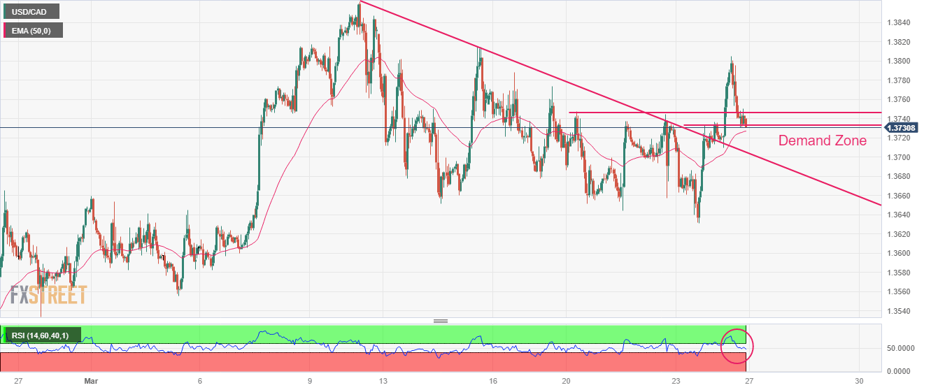 On an hourly scale, USD/CAD has corrected to near the demand zone placed in a narrow range of 1.3737-1.3746. The upside bias for the loonie asset is still solid as it is holding auction above the downward-sloping trendline plotted from March 10 high at 1.3862.