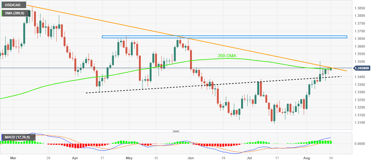 USD/CAD crosses the 200-DMA hurdle as bulls attack the five-month-old descending resistance line early Monday in Europe. In doing so, the Loonie pair justifies the retreat in the WTI crude oil prices, Canada’s key export item, while taking clues from the firmer US Treasury bond yields and the US Dollar amid sour sentiment. That said, the major currency pair rises 0.11% intraday to near 1.3460 by the press time.
