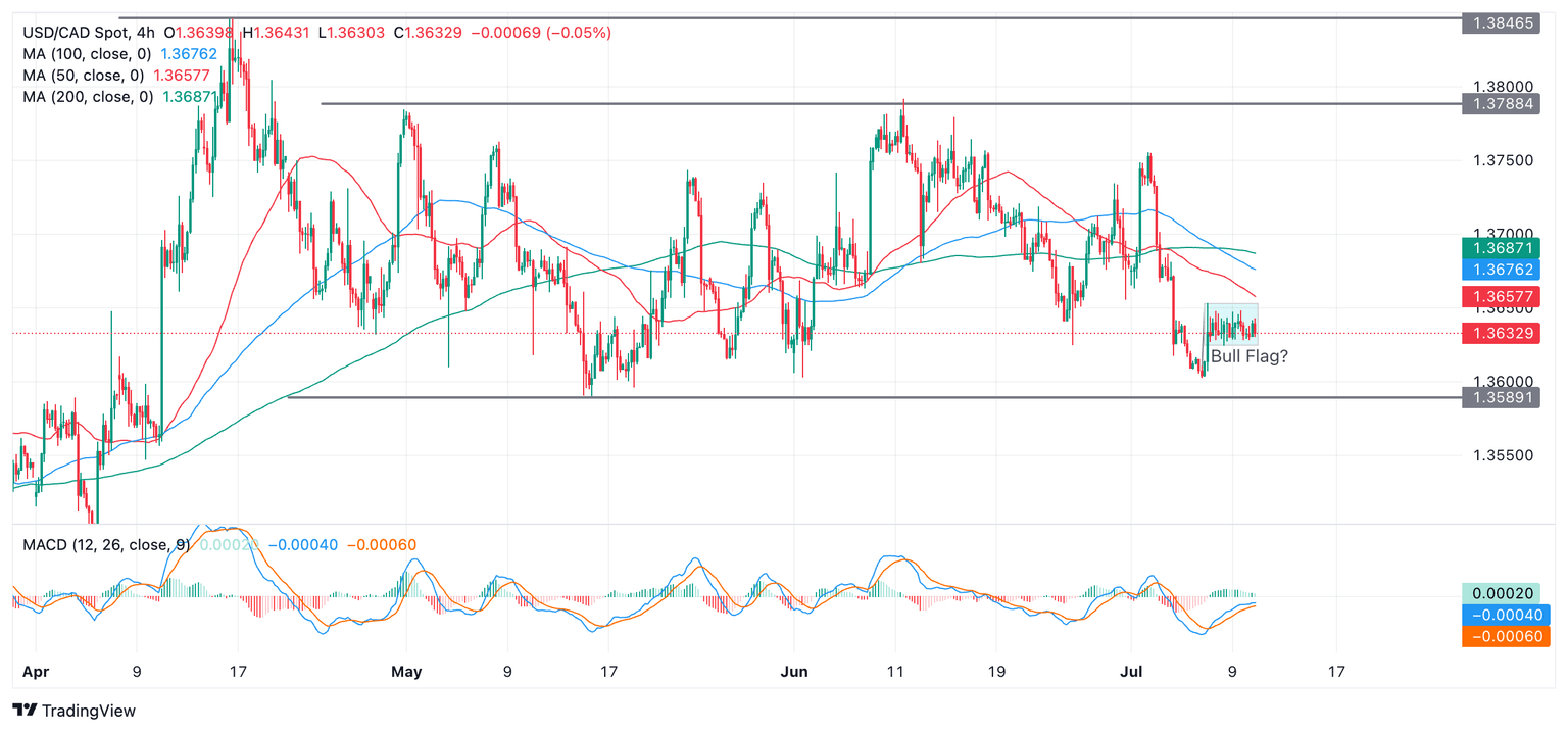 USD/CAD has been trading in a mini-sideways consolidation (light blue shaded area on chart above) since July 5. This might be the “flag square” part of a small Bull Flag Pattern. Such a pattern promises further upside if price breaks out of the top of the rectangular consolidation phase. The target for the follow-through higher after the breakout is situated at 1.3764, the length of the initial bounce or “flag pole” extrapolated higher.