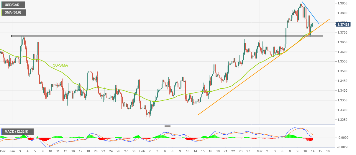 On the flip side, a convergence of the 50-SMA and aforementioned support line from the mid-February, around 1.3700 at the latest, appears the short-term key support for the USD/CAD sellers to watch during the quote’s pullback.