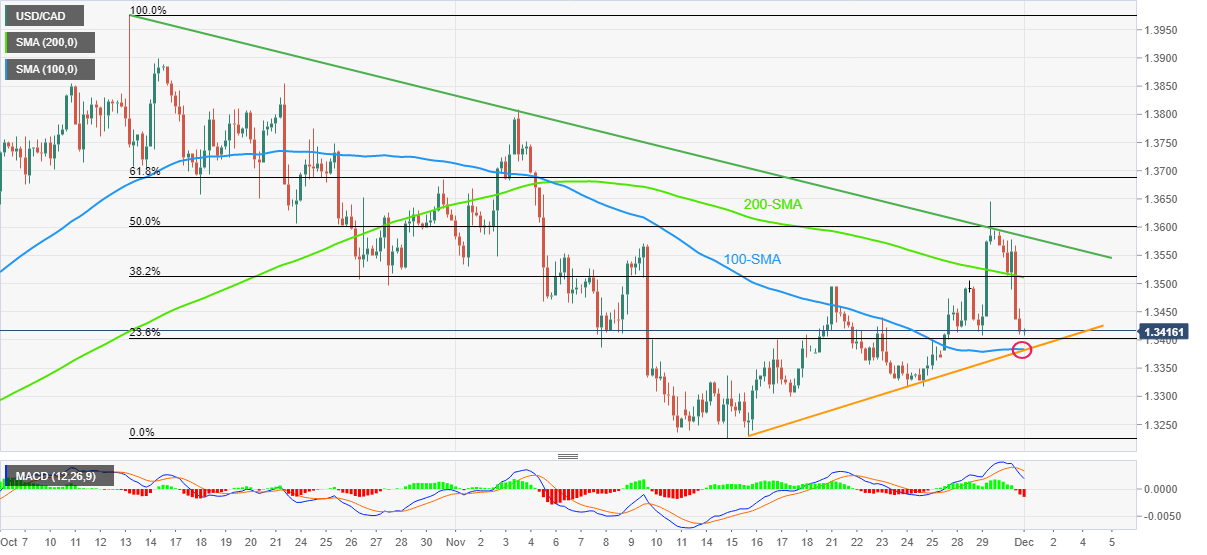 However, the 100-SMA and an ascending support line from mid-November, close to 1.3380, appear a tough nut to crack for the USD/CAD bears.