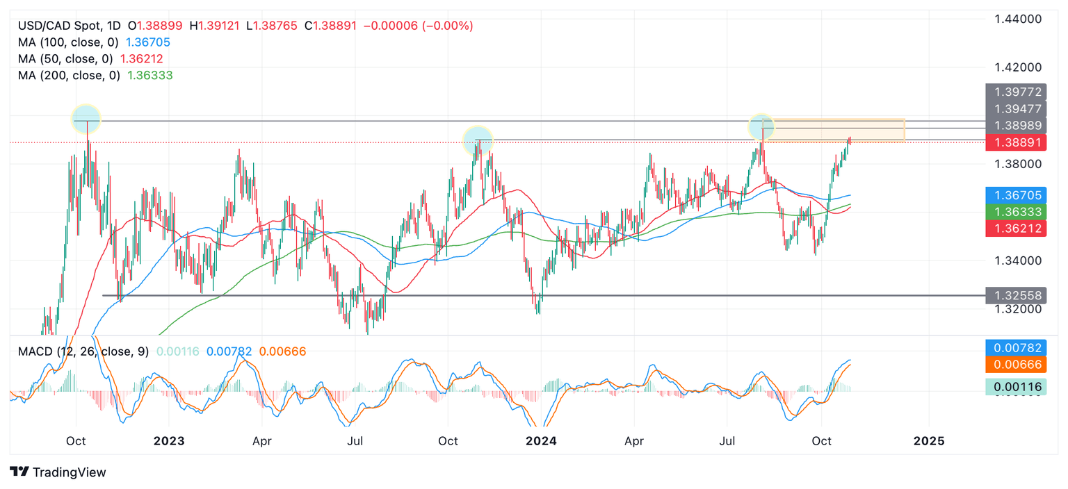 USD/CAD has reached a zone (orange shaded rectangle) in the 1.3800s and 1.3900s composed of resistance from historic highs. These include the August 2024 high, the November 2023 high and the October 2022 high. The peaks have been highlighted with blue circles in the chart above. They comprise the top of the pair’s long-term sideways range.