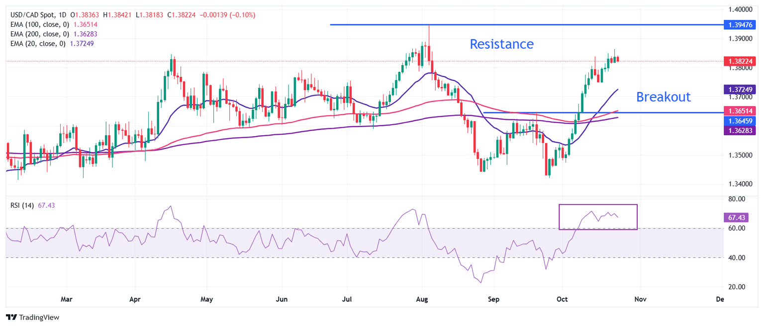 The USD/CAD pair corrects slightly to near 1.3820 in Thursday’s European session after posting a fresh 11-week high above 1.3850 on Wednesday. The Loonie pair has shown a one-sided rally since September 25, which appears to have paused for a while as investors look for fresh cues about the likely monetary policy action by the Bank of Canada (BoC) and the Federal Reserve (Fed) in the remaining year.