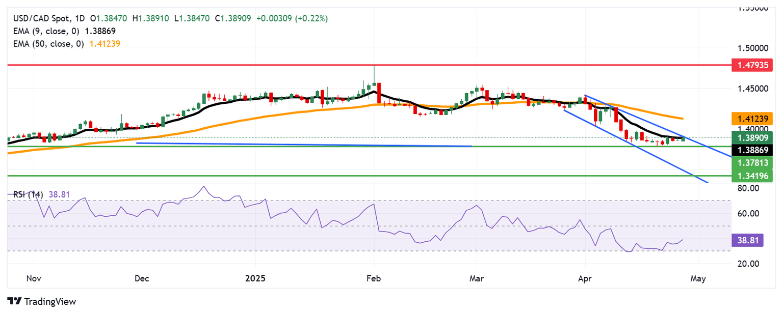 USD/CAD Price Forecast: Tests nine-day EMA near 1.3900 resistance level