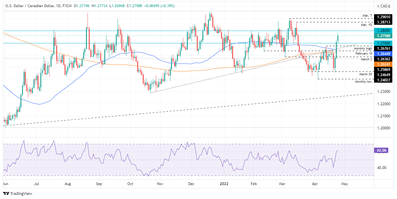 The USD/CAD rallies in the middle of a flight to safe-haven peers in the FX space, using the US dollar, the JPY, and the CHF as safety vehicles in a risk-off market mood. Also, falling oil prices and increasing bets that the Federal Reserve would hike rates 0.50% in the May 4-5 meeting boost the prospects of the greenback. At the time of writing, the USD/CAD is trading at 1.2755 at fresh monthly highs at the time of writing.