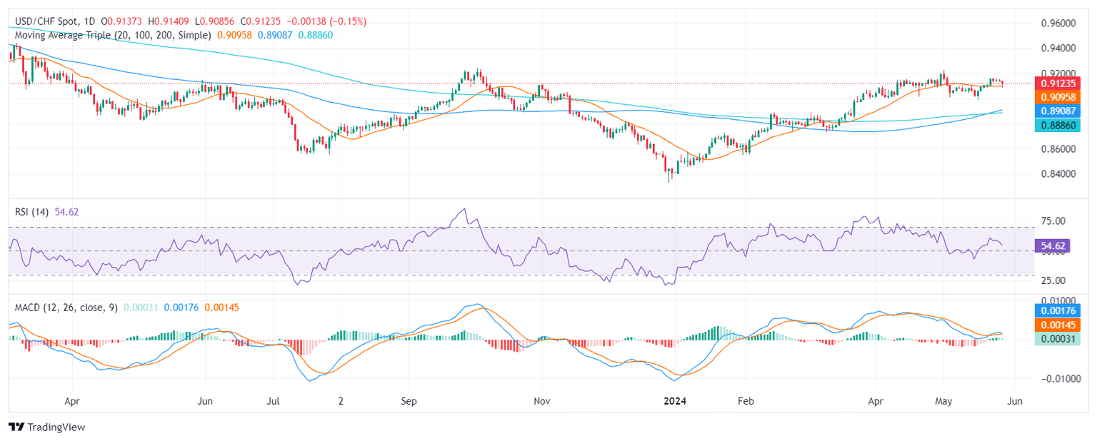 - USD/CHF took a dip in Tuesday’s session and fell to 0.9110.