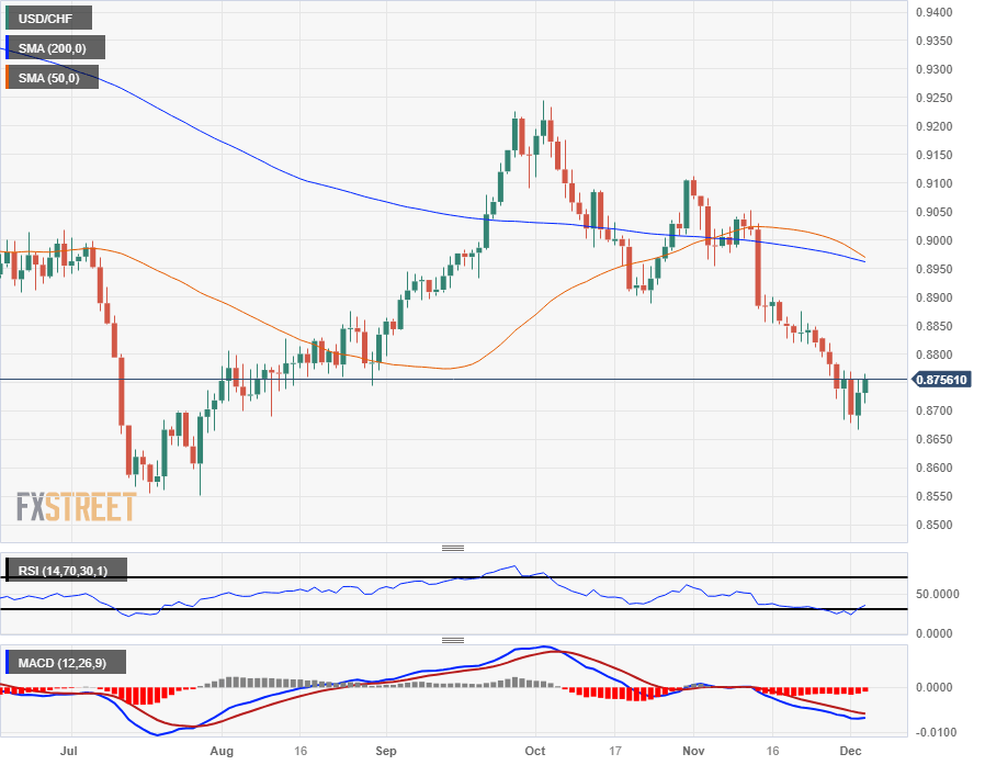 The USD/CHF saw an accelerated decline after dropping through in 0.8900 handle in November, and the pair has continued to swirl the drain ever since, shedding another 200 pips to hit chart territory near the 0.8700 handle.