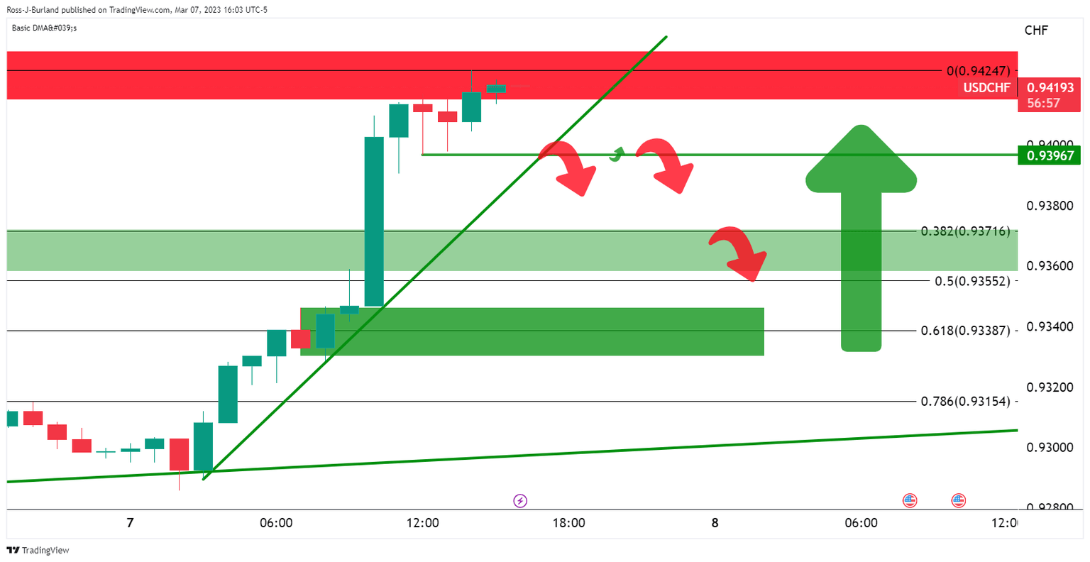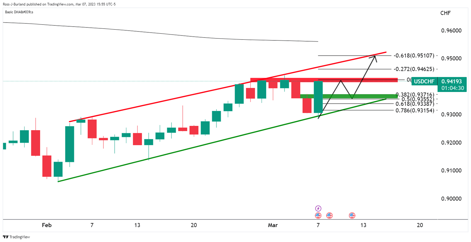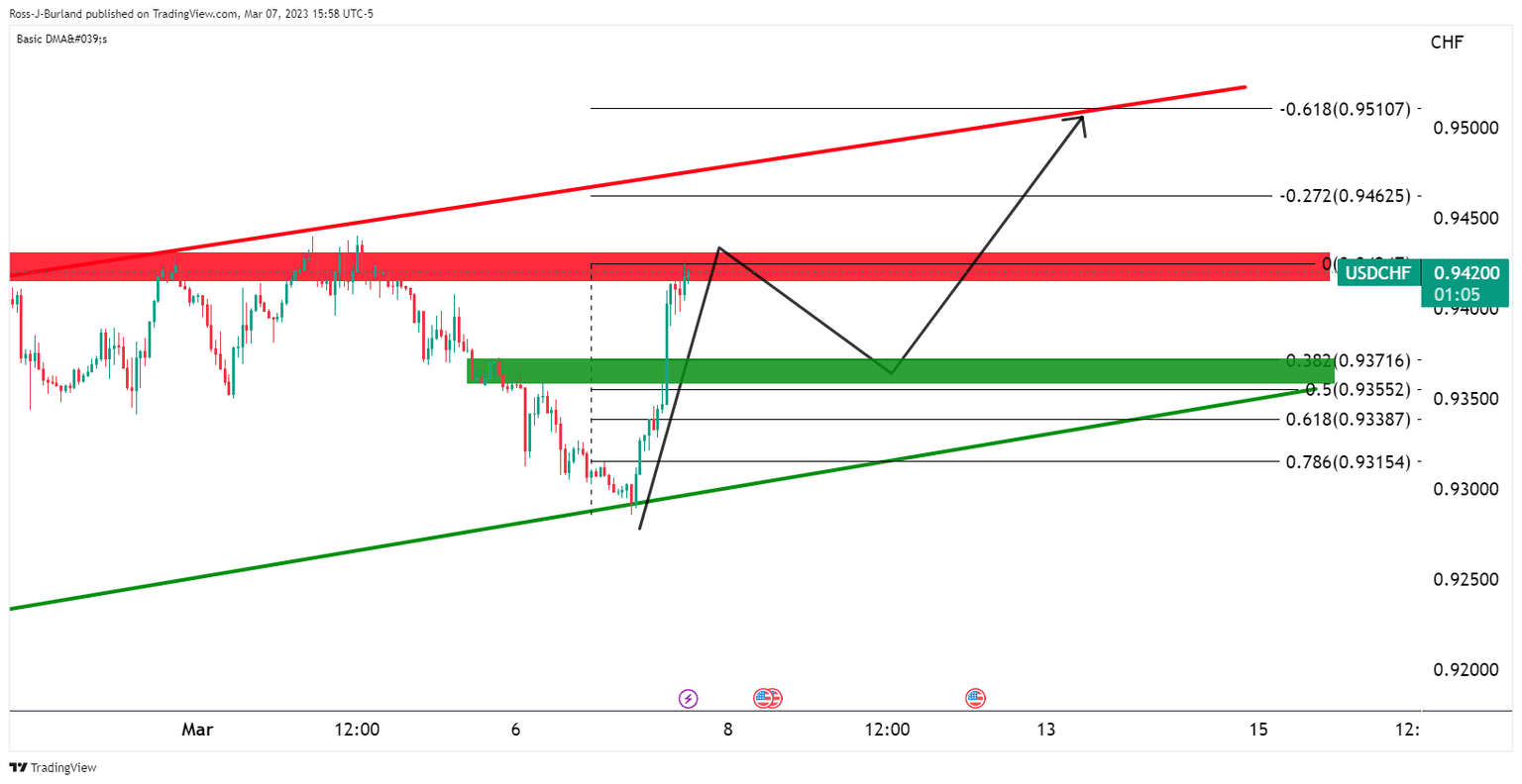 - USD/CHF bulls still in play but there are prospects of a meanwhile correction.