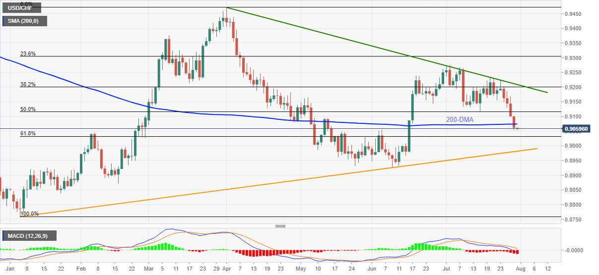 USD/CHF picks up bids inside a less than 10-pip area surrounding 0.9050 during Friday’s Asian session. The major currency pair dropped to the lowest since June 16 the previous day after breaking 200-DMA.