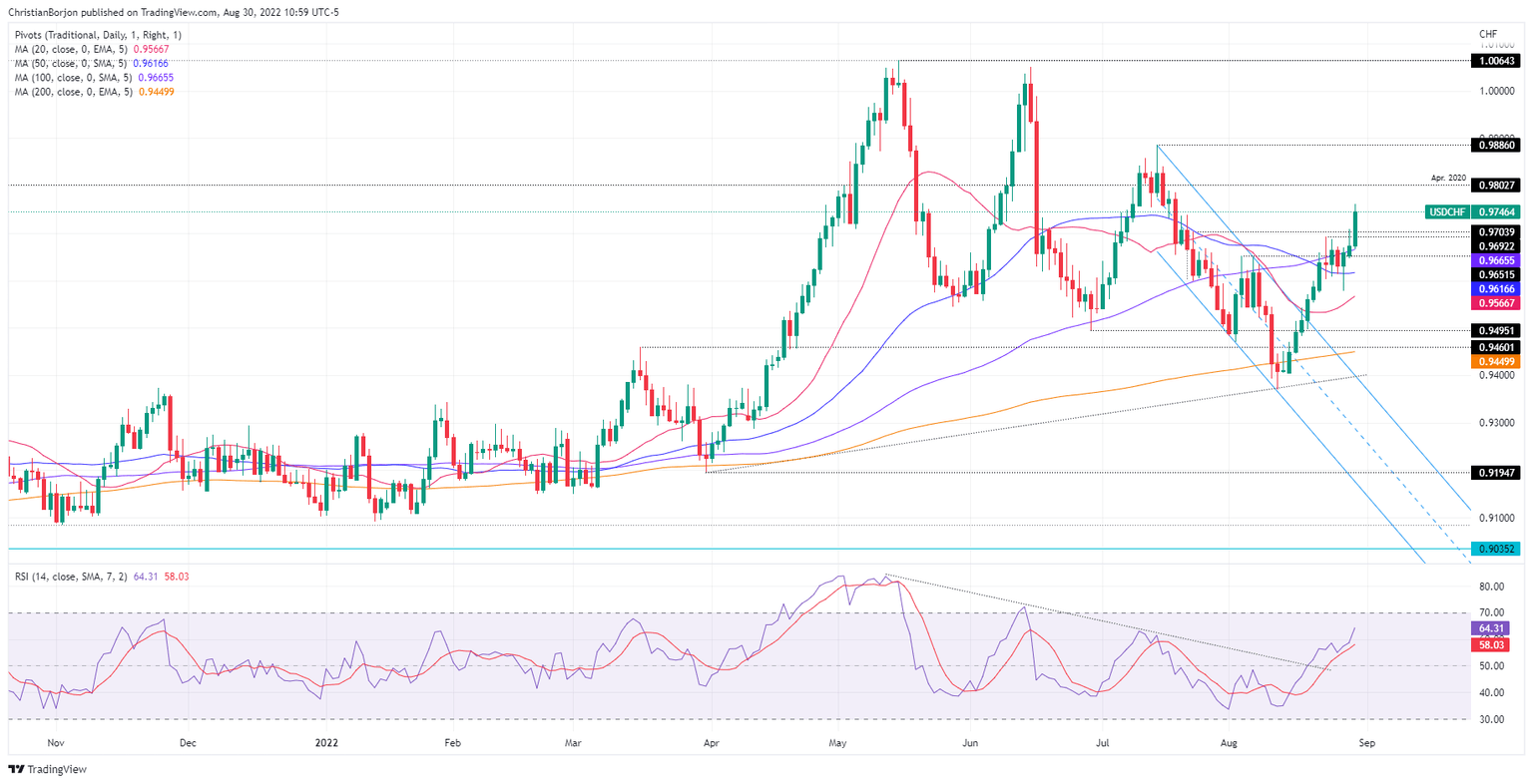 Hence, the USD/CHF first resistance would be the 0.9800 figure, followed by the July 14 daily high at 0.9886, ahead of the psychologically 0.9900 mark. On the other hand, the USD/CHF first support would be the 0.9700 figure. Once cleared, the next demand area would be the 100-day EMA at 0.9665, followed by the 50-day EMA at 0.9616, and then the August 26 daily low at 0.9577.