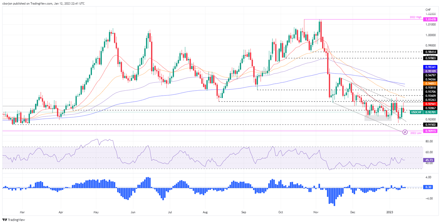After attempting to clear 0.9300, the USD/CHF resumed its downtrend due to the release of a softer inflation report in the United States (US), which spurred a repricing for a less aggressive Federal Reserve (Fed); consequently, the US Dollar weakened. Therefore, the USD/CHF erased its earlier gains and dived beneath 0.9280 as the Asian session began. At the time of writing, the USD/CHF is almost unchanged, around 0.9270.