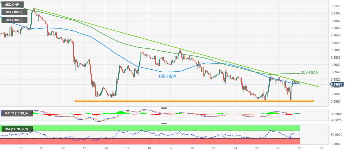 Meanwhile, the 100-HMA and the top line of the aforementioned triangle, respectively near 0.8910 and 0.8915, guard the short-term recovery of the USD/CHF pair.