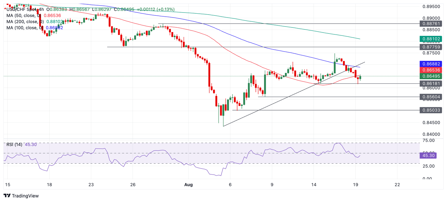 USD/CHF reversed course after posting a new low on August 5 and started trending higher. The pair began a sequence of higher highs and lows on the 4-hour chart suggesting it was in a short-term uptrend. It peaked at 0.8749 on August 15. Since then it has been correcting back. It reached a new low of 0.8616 on August 19.