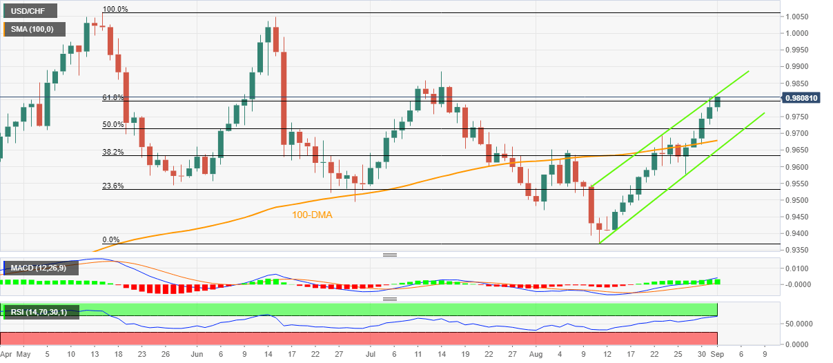 USD/CHF takes the bids to refresh the six-week high near 0.9805 during Thursday’s Asian session. In doing so, the Swiss currency (CHF) pair attacks the 61.8% Fibonacci retracement level of the May-August downside during the five-day uptrend.