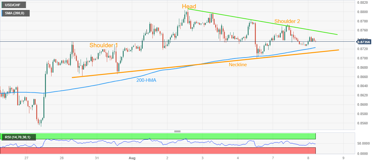 It’s worth noting that the 200-HMA restricts immediate downside of the USD/CHF pair around 0.8725 but major attention is given to the stated H&S formation’s neckline surrounding 0.8710.
